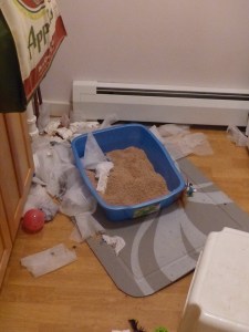 Your more sedate sister here. Not quite so sedate now as I was then. Thanks to our new baby Smudge. Actually, he’s over one year old. Some days are worse than others. Here’s an early ‘worse day’ scenario. We confined him to the laundry room overnight until he was a year old. This greeted us one fine morning! Smudge, of course, is nowhere in sight.