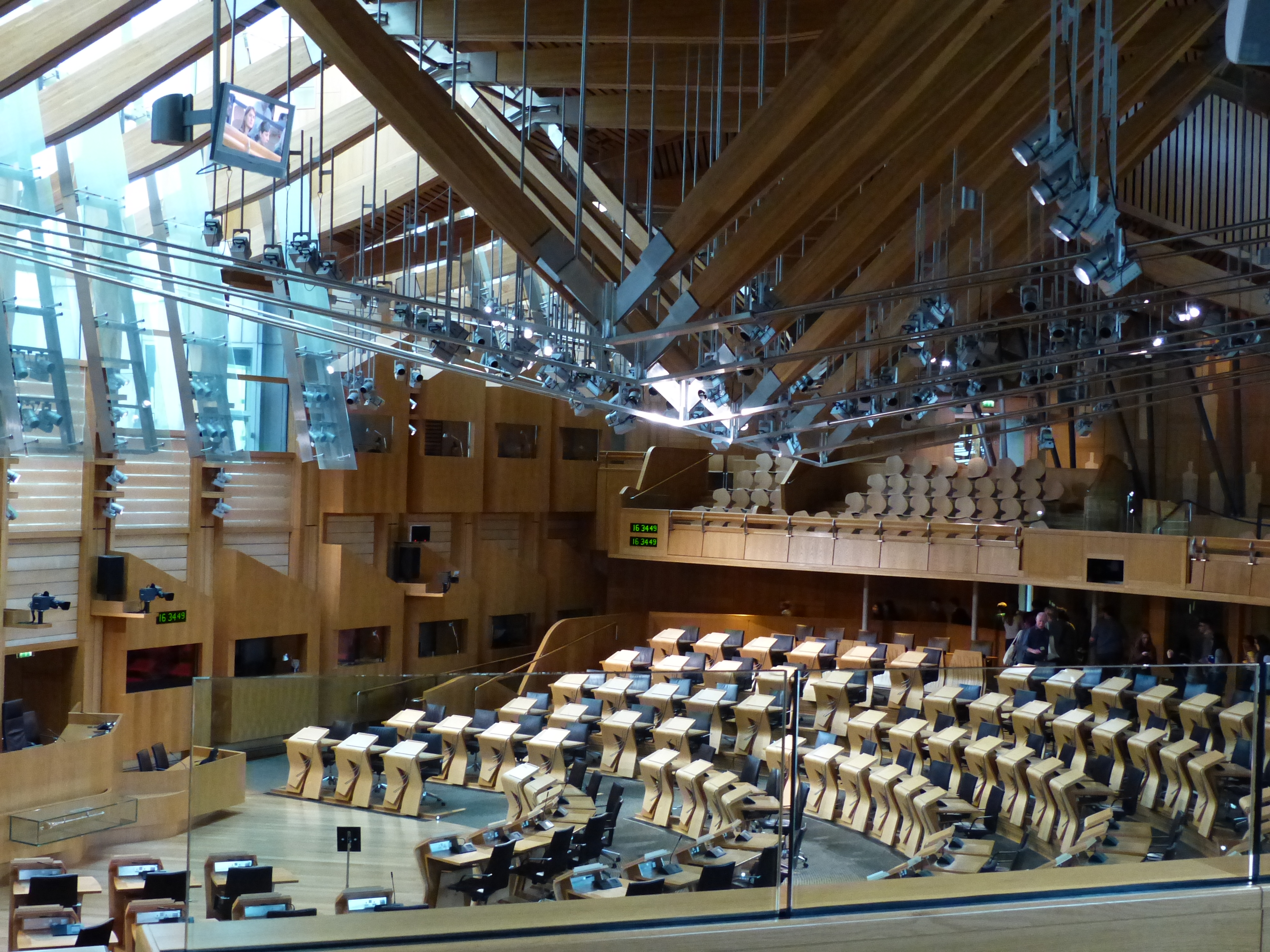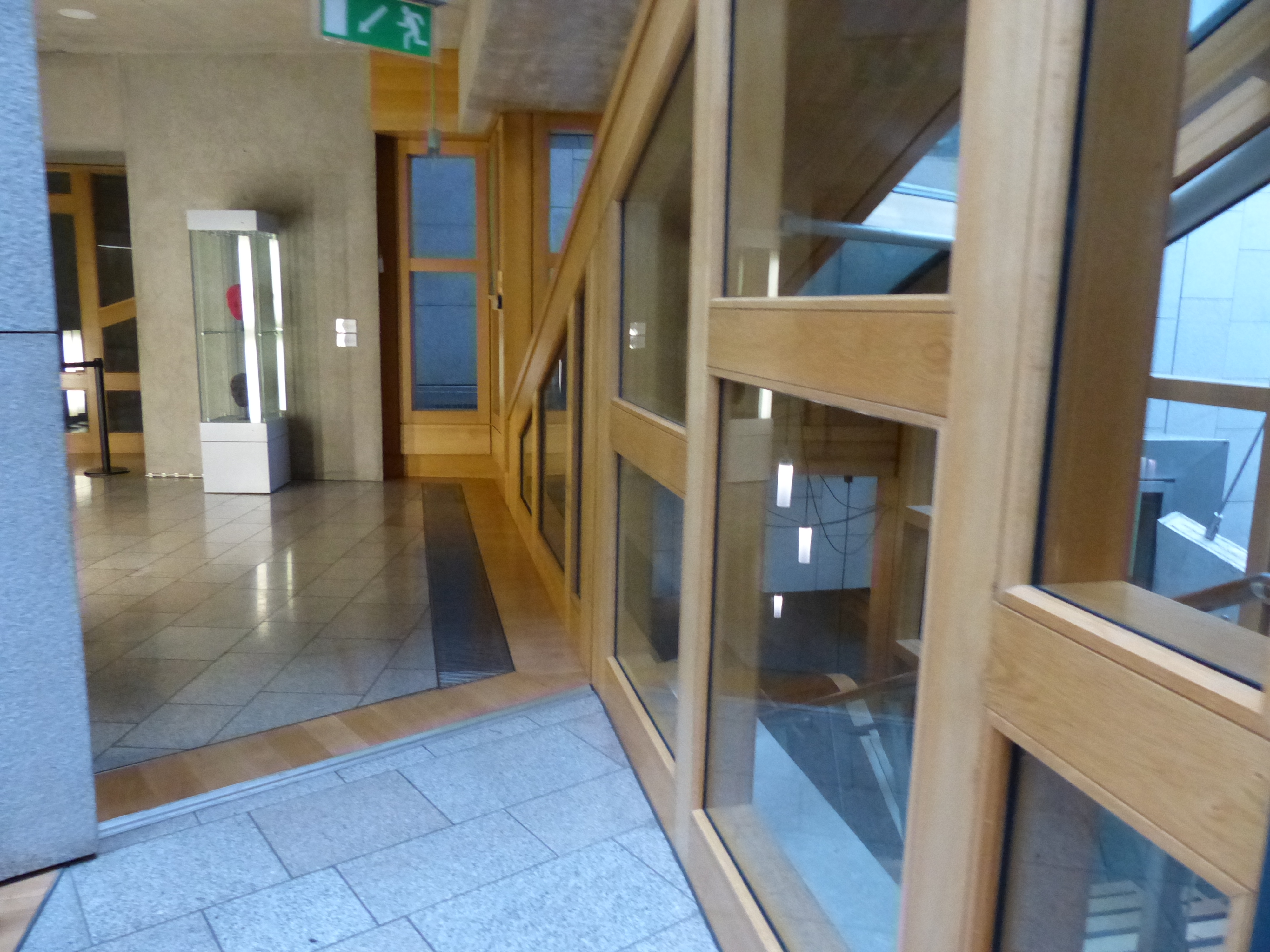 Now we’re at the top level–where the Scottish Parliament meets. Light galore–both natural (it was a grey day outside) and artificial. We’re sitting in the visitor’s gallery, looking down to the main floor. Click to enlarge! Don’t miss the live feed at the very top. Maybe other visitors looking down from the gallery?