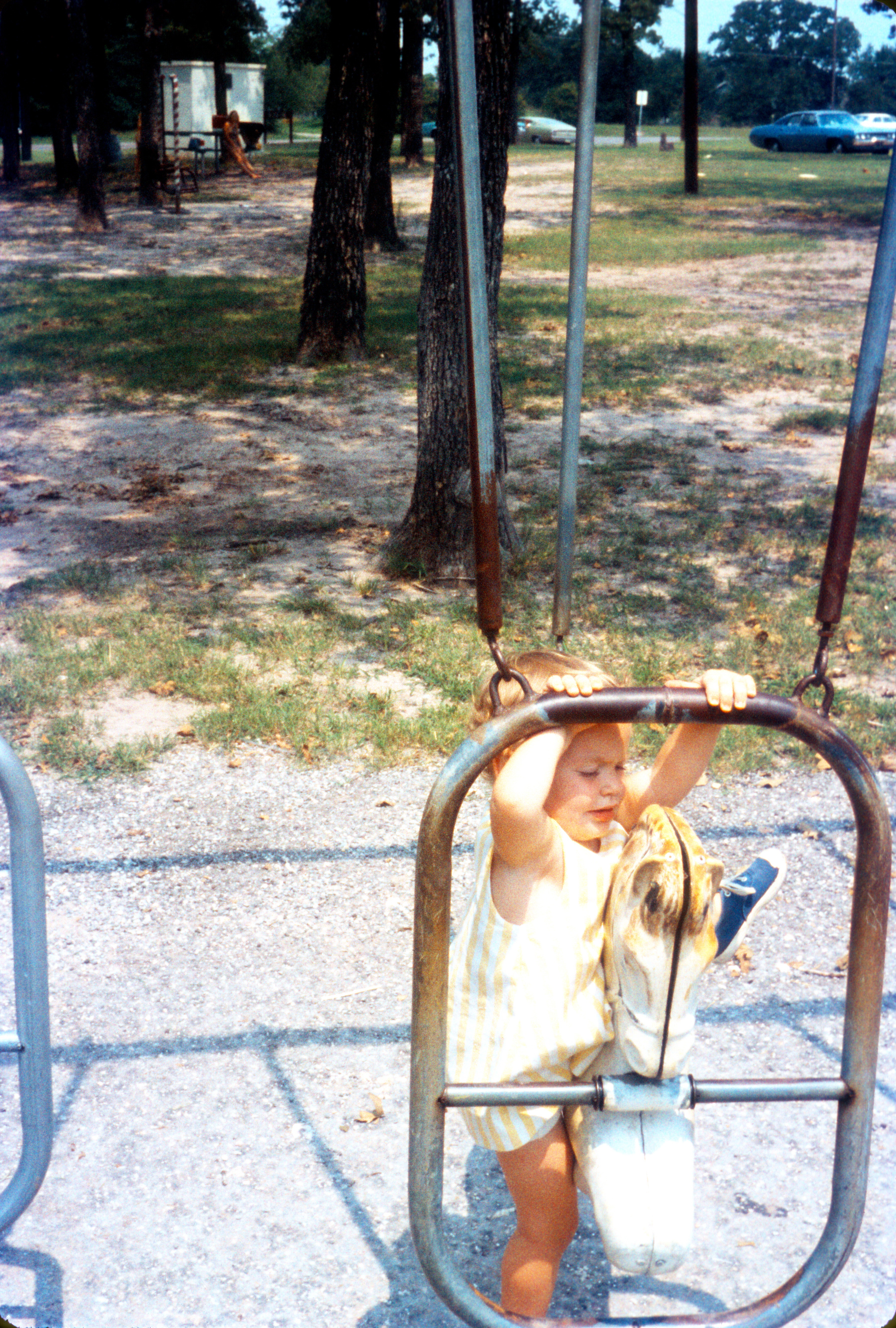 Finally, our 2-year old daughter at the same park, determined to get on that horse all by herself! Which she did, believe it or not.