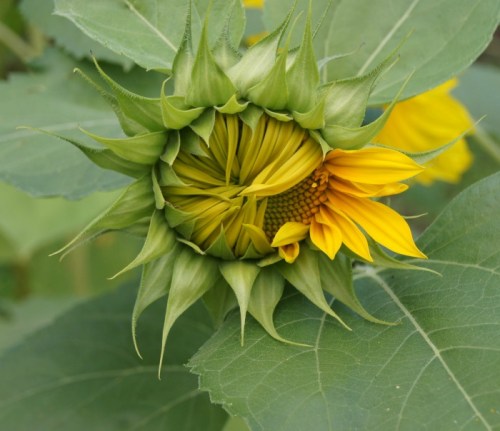 On a lighter note, we’re watching a brave patch of sunflowers growing in our back yard. Remnants left behind from the large bird feeder we put out this past winter. Yesterday I saw the first bits of yellow petals beginning to unfold. It looks like we might have 7 flowers in all, thanks to the kindness of winter birds dropping sunflower seeds (among other things) in the snow! According to the chart above and their current height, I think they’re Giant Singles (about 5 feet high).