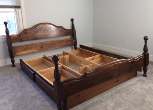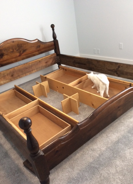 The top photo shows our lovely kitty, Smudge, sitting in the middle of the waterbed’s bare bones. Below you can see the skeleton laid out for reassembly. The metal rails (above) are for under-the-bed drawers, two on each side. As shown here: